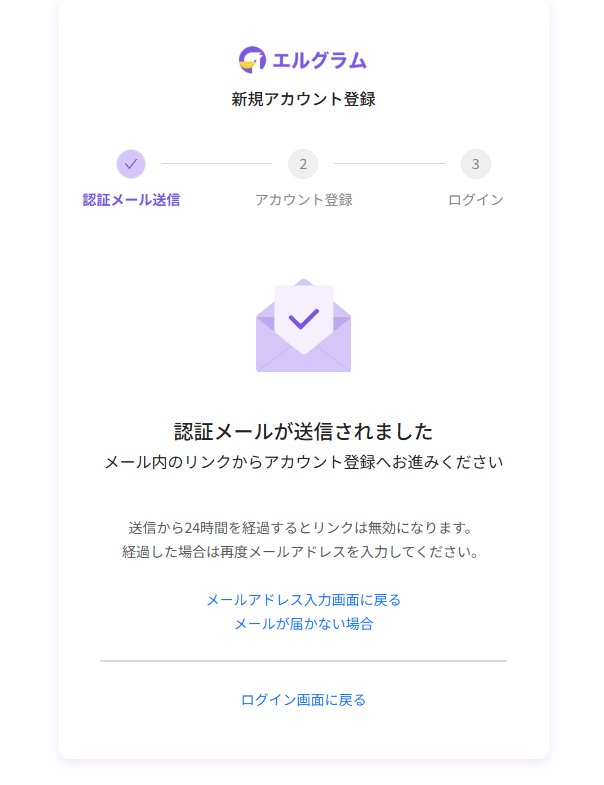登録したメールアドレスに認証メールが届きます。24時間以内にリンクをクリックしてください。