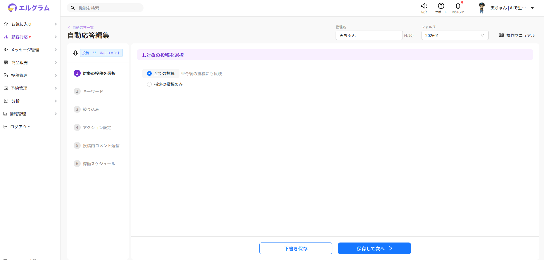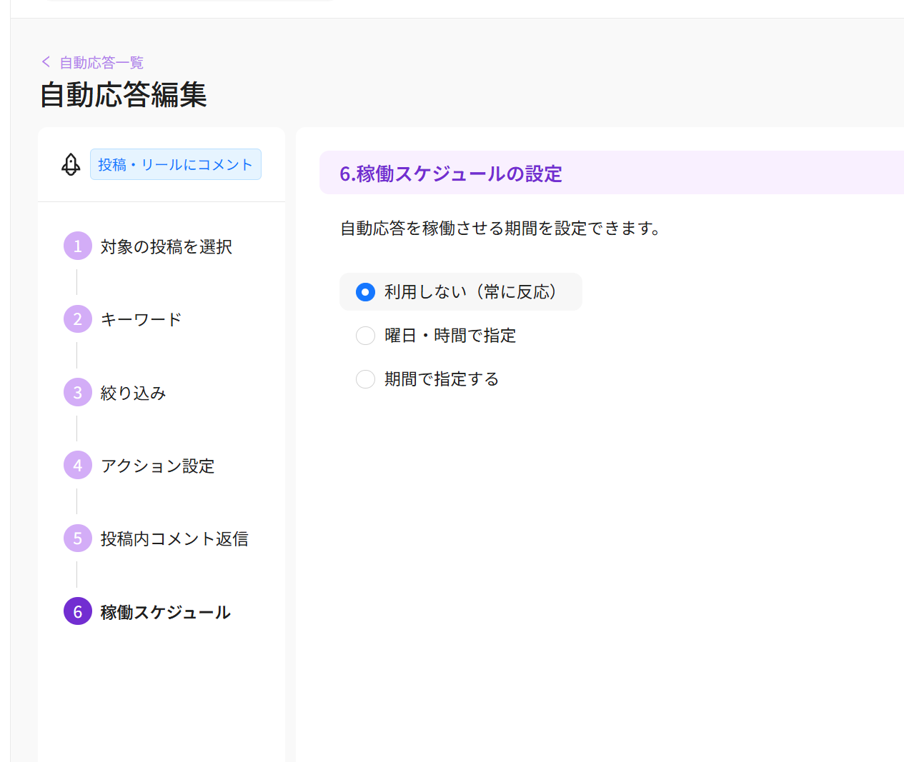Q: 既存の投稿にも自動応答を設定できますか? A: はい。「特定の投稿」を選択して、既存の投稿に対しても自動応答を設定できます。