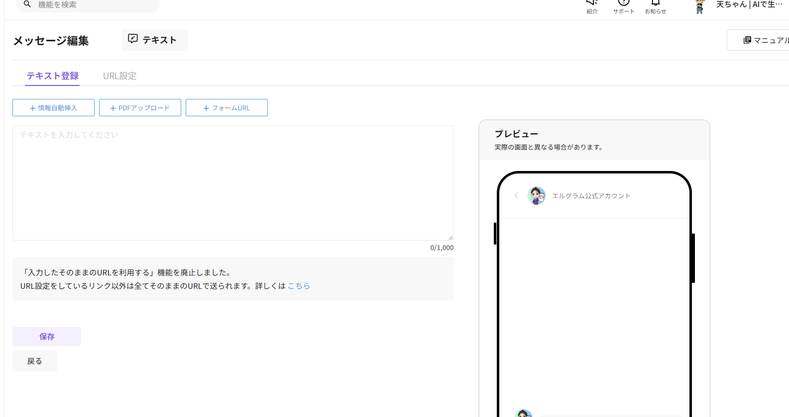 注意: URL設定を使用すると短縮URLに変換されます。そのままのURLを送信したい場合は、テキストに直接URLを入力してください。