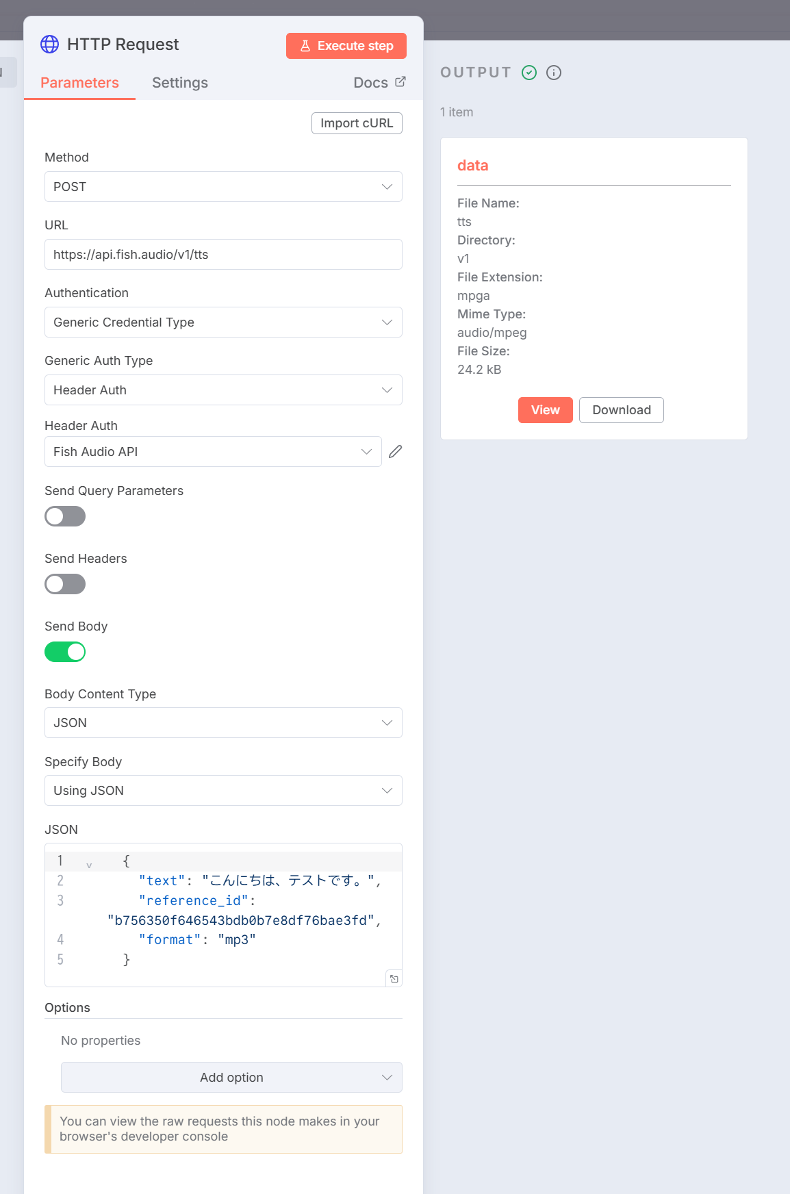 - n8nからFish Audio APIを呼び出して音声ファイルを生成できる