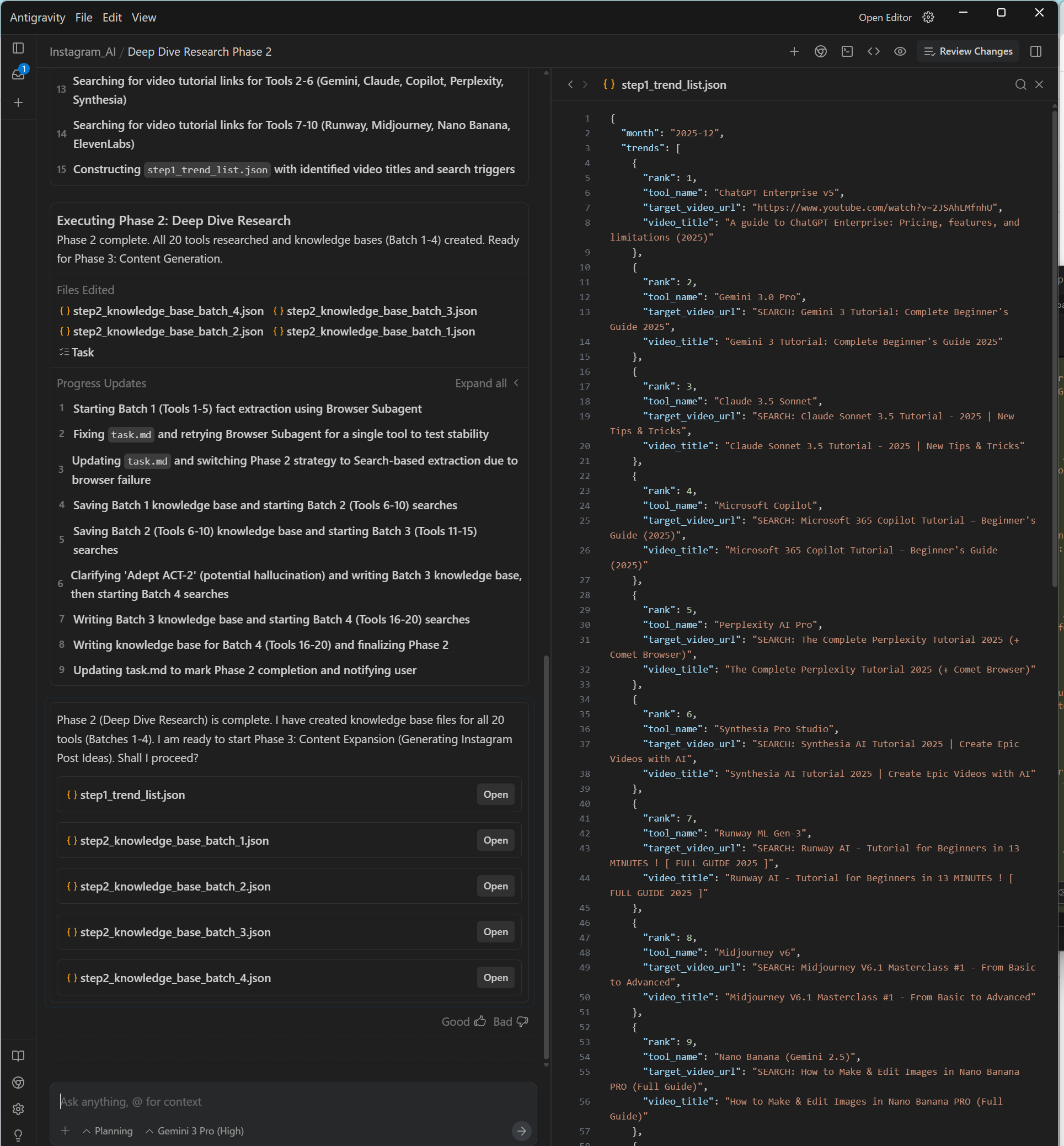 - Antigravityはブラウザ操作ができるため、YouTube動画から事実を抽出可能
