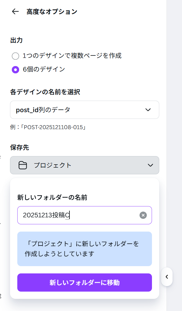 | 各デザインの名前を選択 | post_id列のデータ | ファイル名がPOST-2025121108-015のような形式になる |