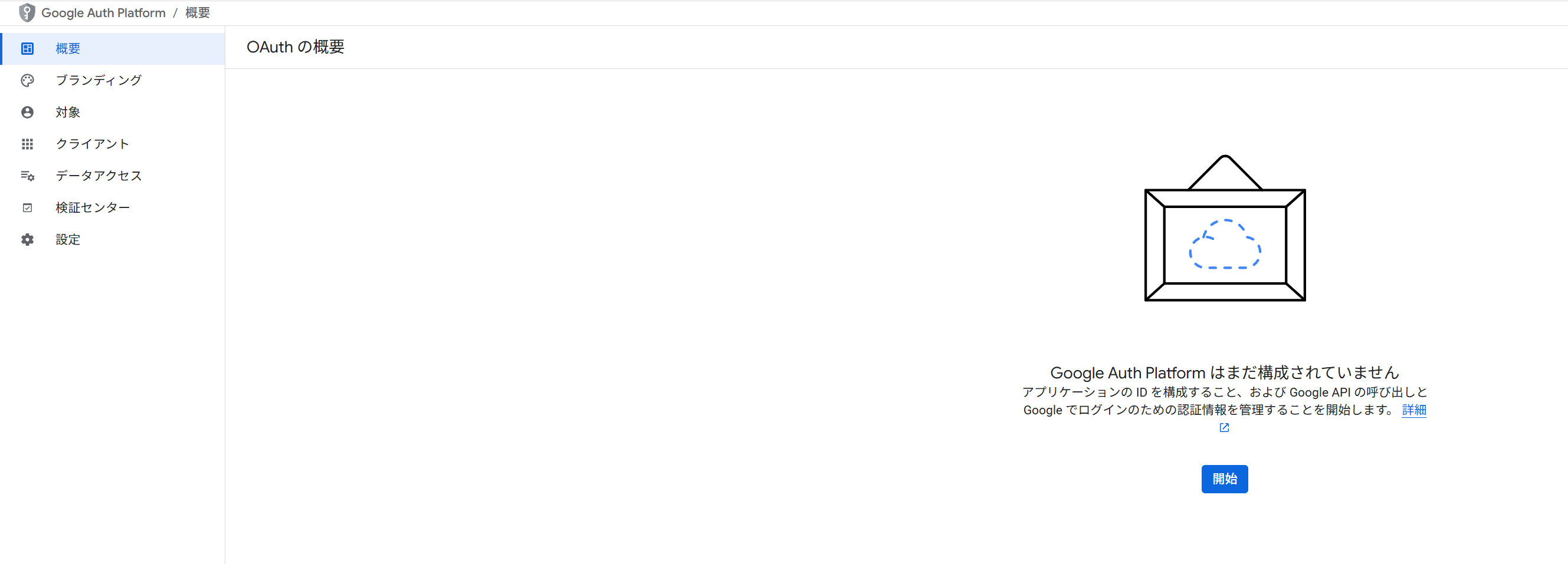 - 「Google Auth Platformはまだ構成されていません」と表示されたら 「開始」 をクリック