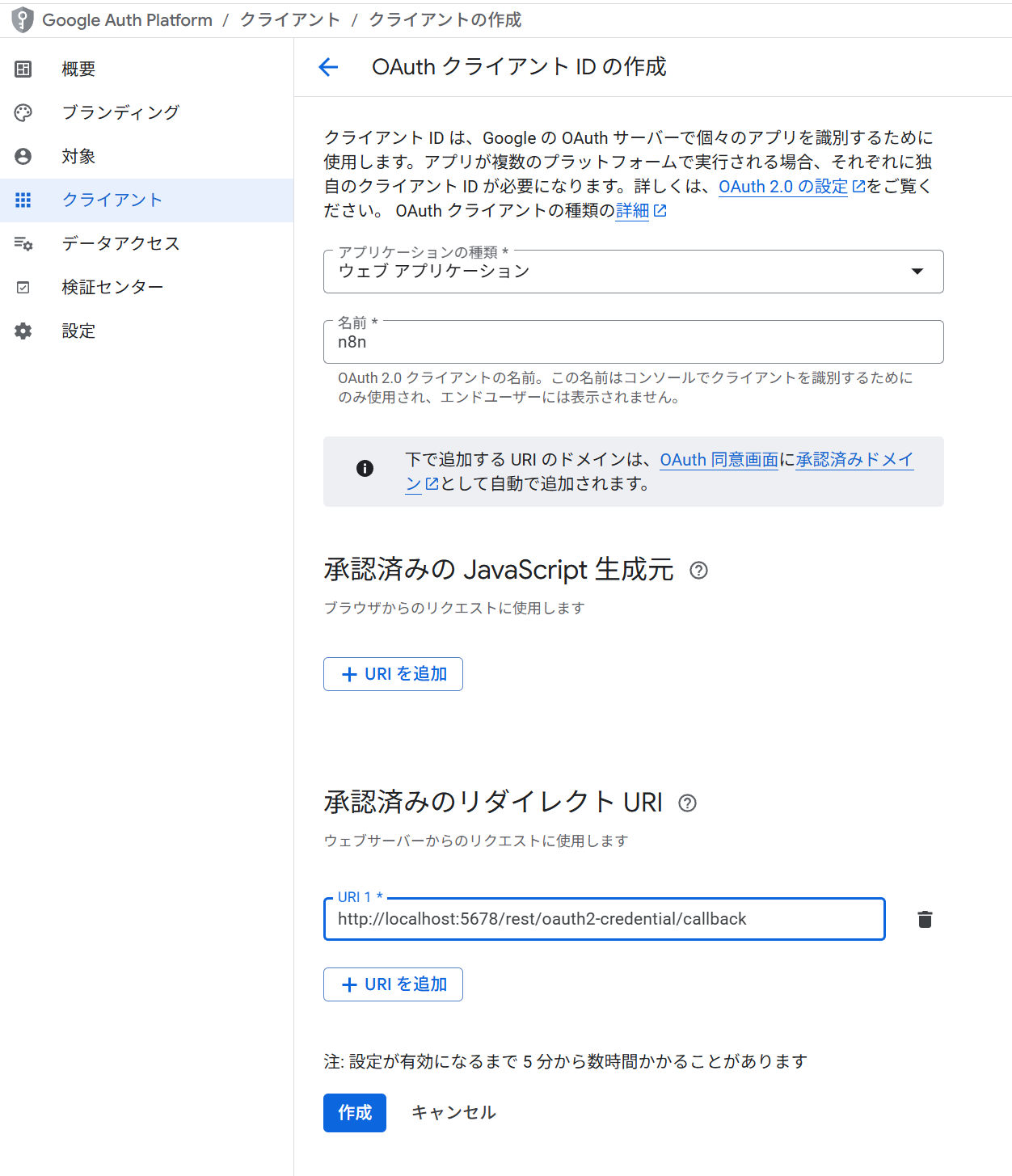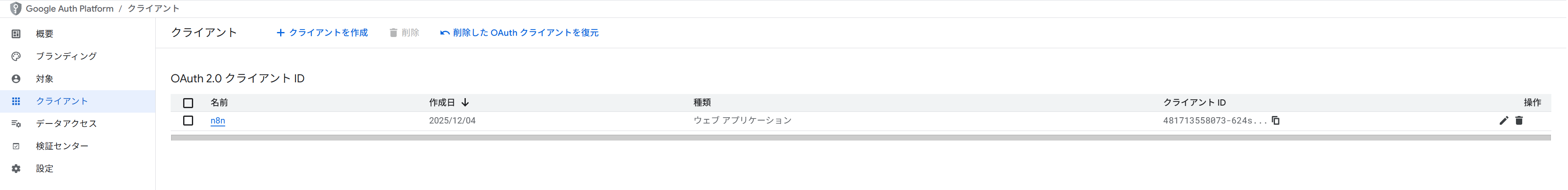n8nがGoogleにアクセスするための認証情報(クライアントID / シークレット)を作成します。