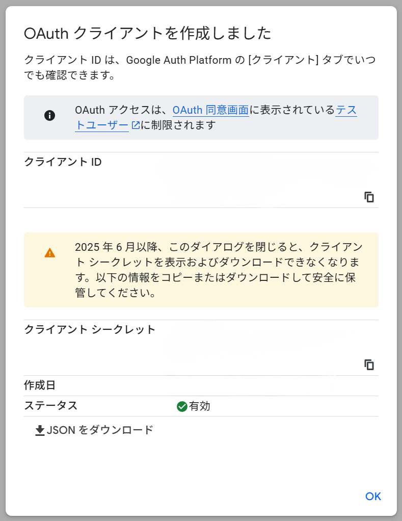 - Google Cloud Console → 認証情報 → 作成したOAuthクライアント