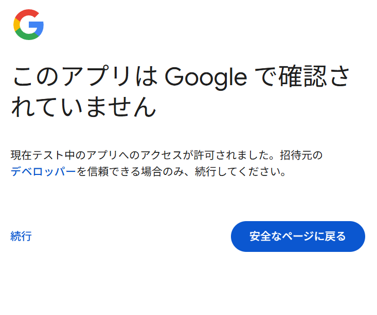 Q: テストモードのままで問題ありませんか? A: 個人で使用する分には問題ありません。テストモードでは最大100人のテストユーザーが利用でき、トークンの有効期限は7日間です。本番環境で多数のユーザーに公開する場合はGoogleの審査が必要です。