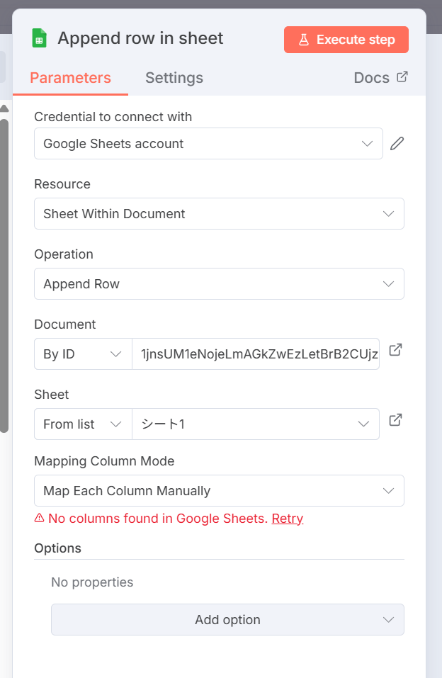 症状: Append rowやUpdate row設定時に「No columns found」と表示される