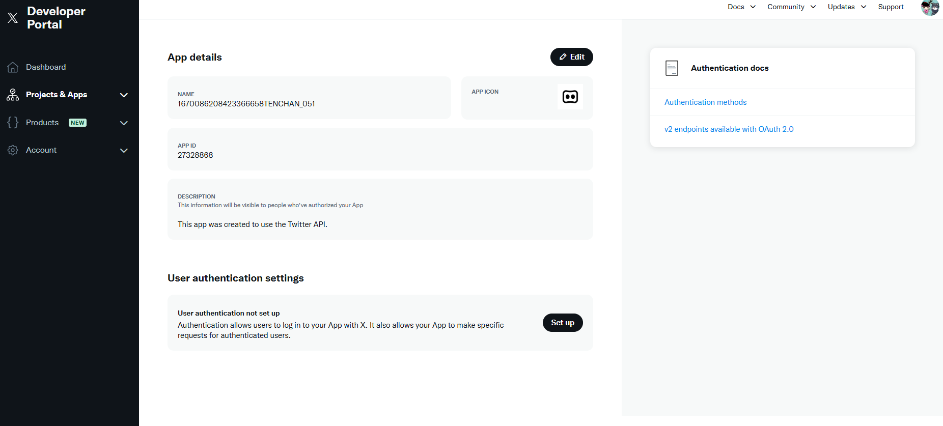 | API Secret | アプリの秘密鍵(Consumer Secret) |