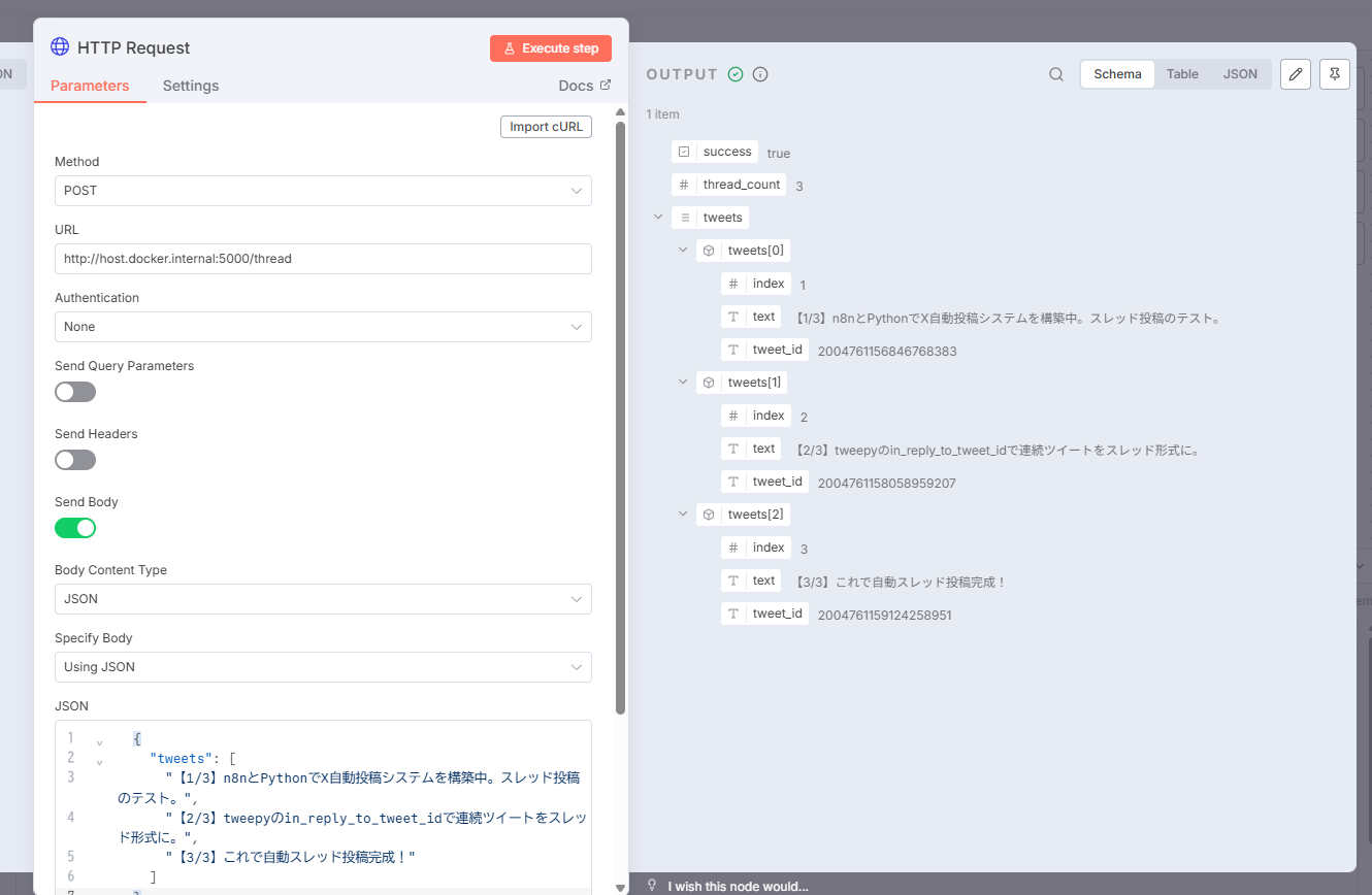 "text": "【1/3】n8nとPythonでX自動投稿システムを構築中。スレッド投稿のテスト。"