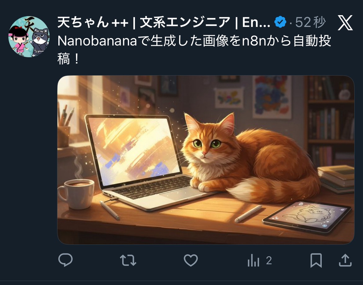 "text": "Nanobananaで生成した画像をn8nから自動投稿!",