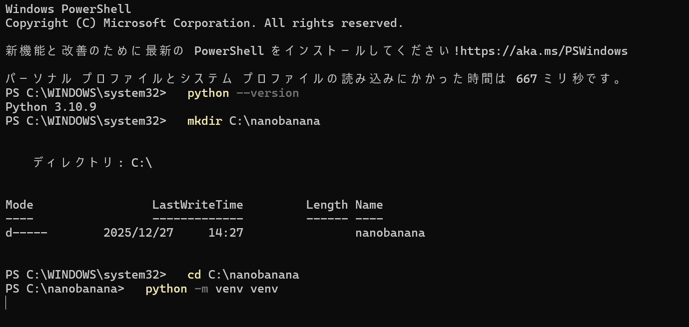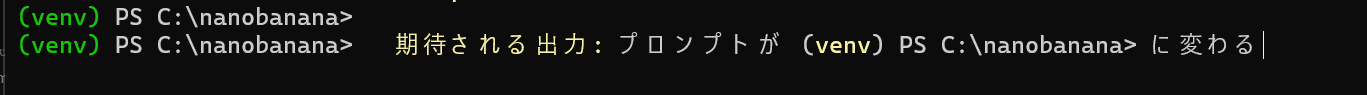 プロンプトの先頭に (venv) が表示されれば成功です。