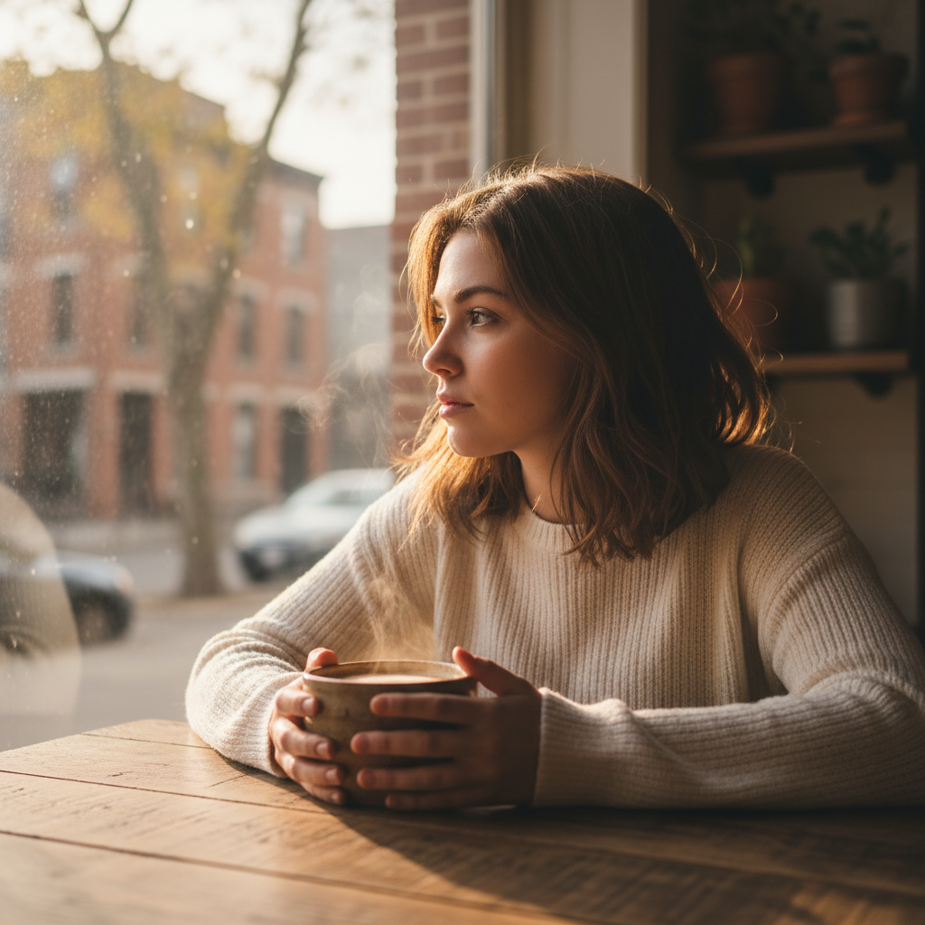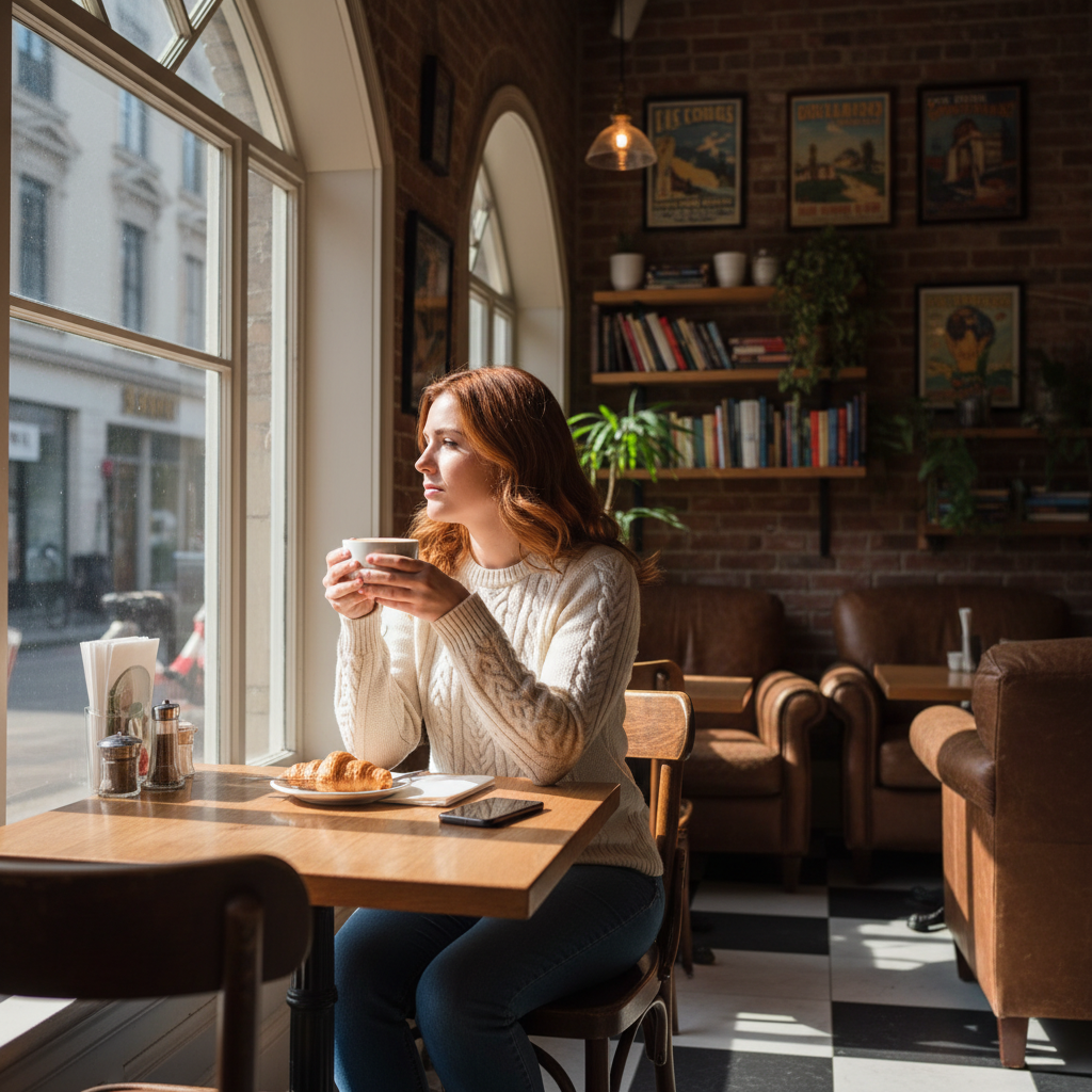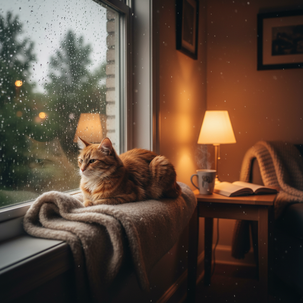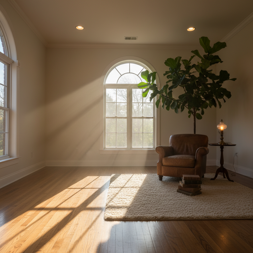 velvet sofa. Warm afternoon sunlight streaming through nearby
