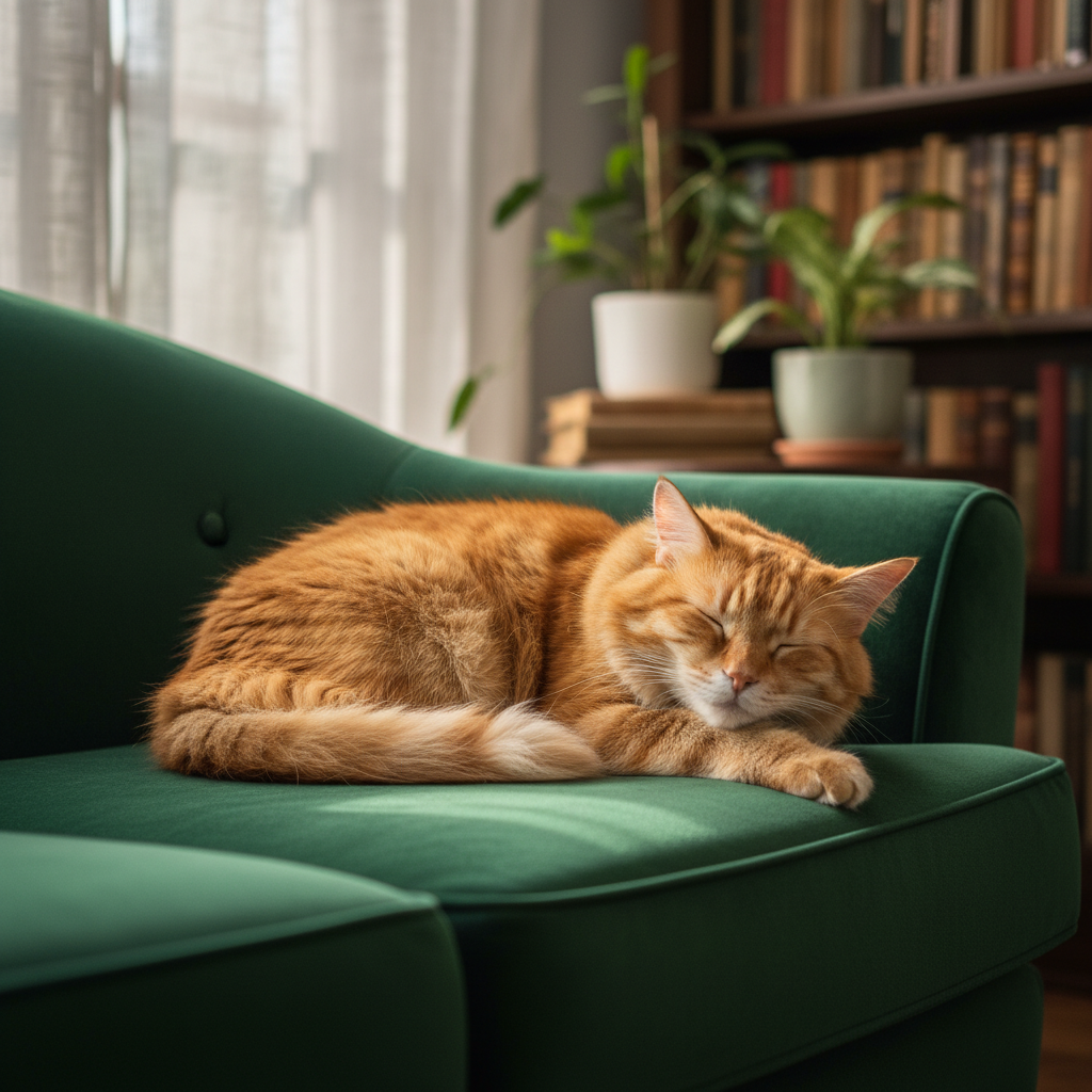 A cat sleeping on a sofa. Warm afternoon sunlight streaming
