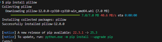 完全版スクリプトはPIL(画像処理ライブラリ)を使用します。以下を実行してインストールしてください(PowerShell、Git Bash共通):