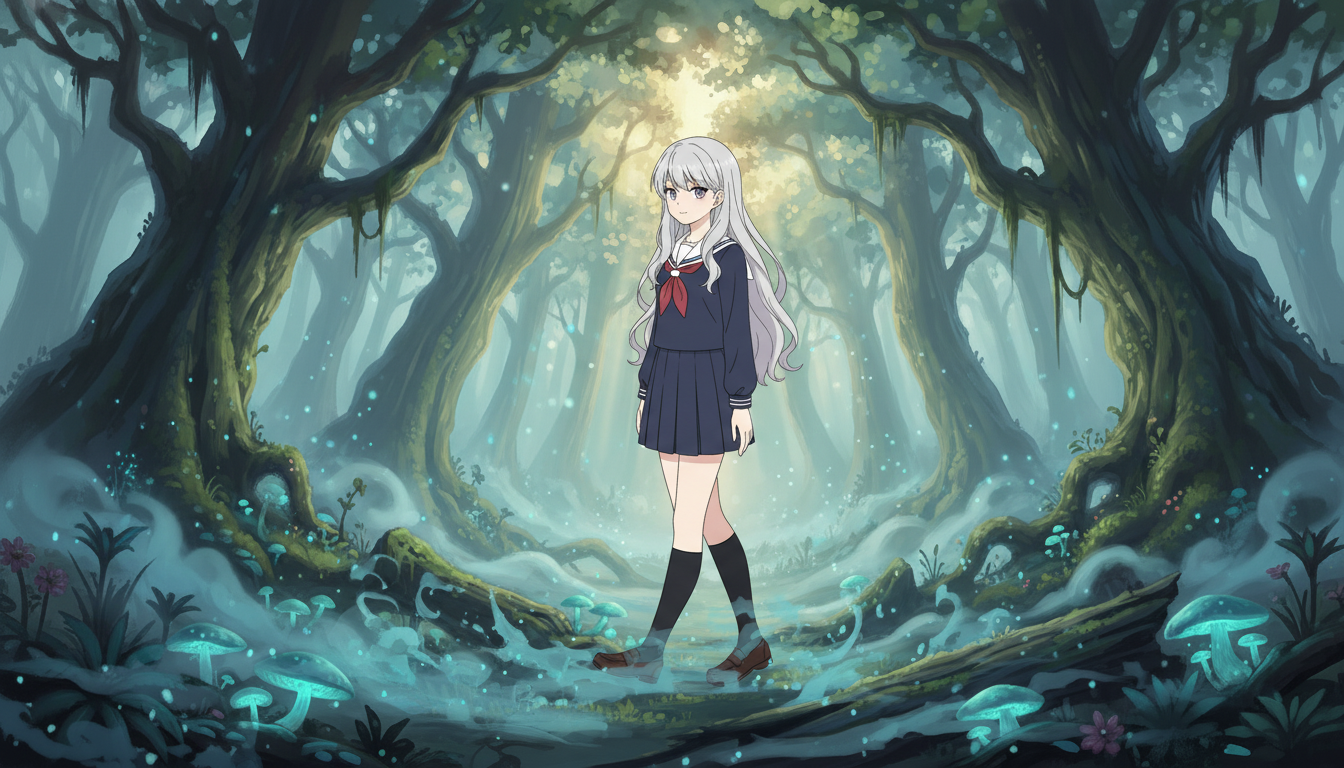 Environment: dense magical forest with glowing mushrooms, misty atmosphere