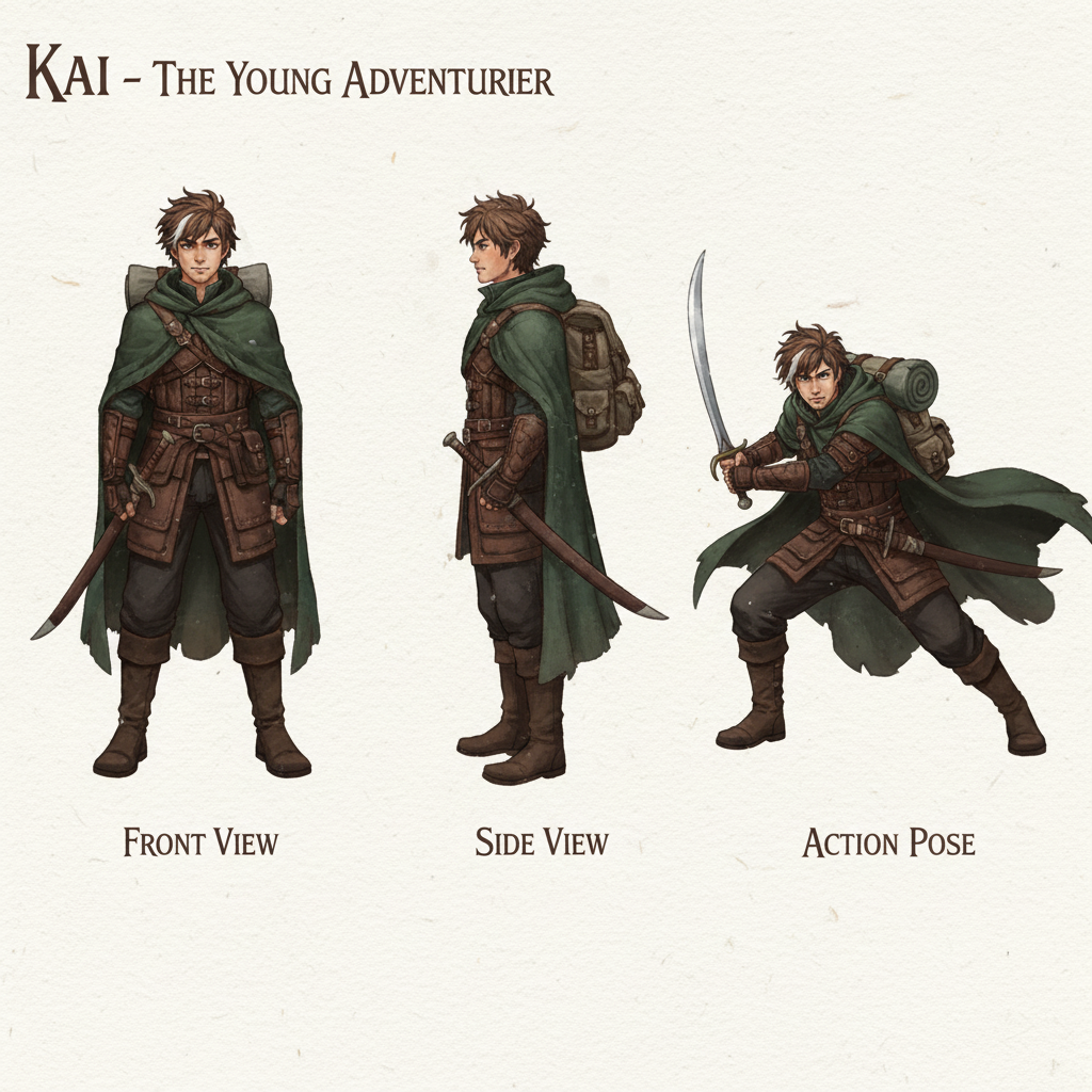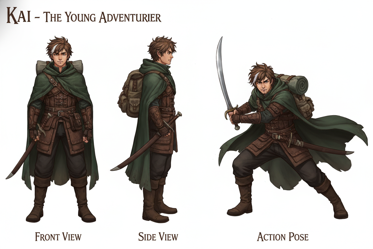 Character design sheet for Kai, a young adventurer: