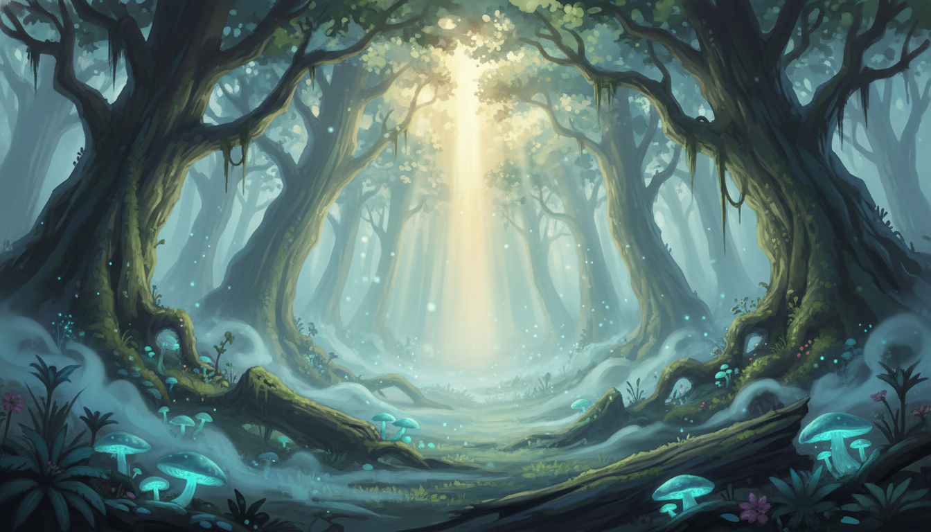 | 森の中 | 光るキノコのある魔法の森、霧がかった雰囲気 |