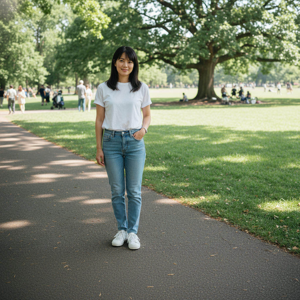 A photorealistic outdoor photo of a 30-year-old Japanese woman in a summer park.